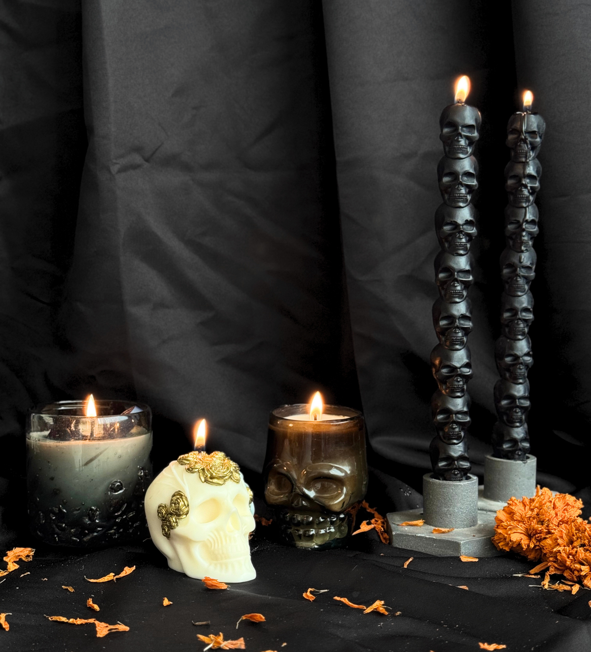 Cada pieza está diseñada como un tributo de luz y aroma para honrar la tradición, llevando la magia de las flores, las calaveras y la esencia del altar a tu espacio.