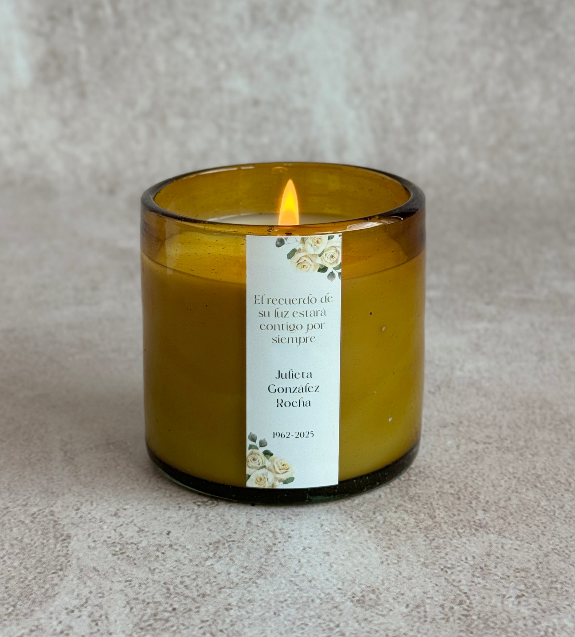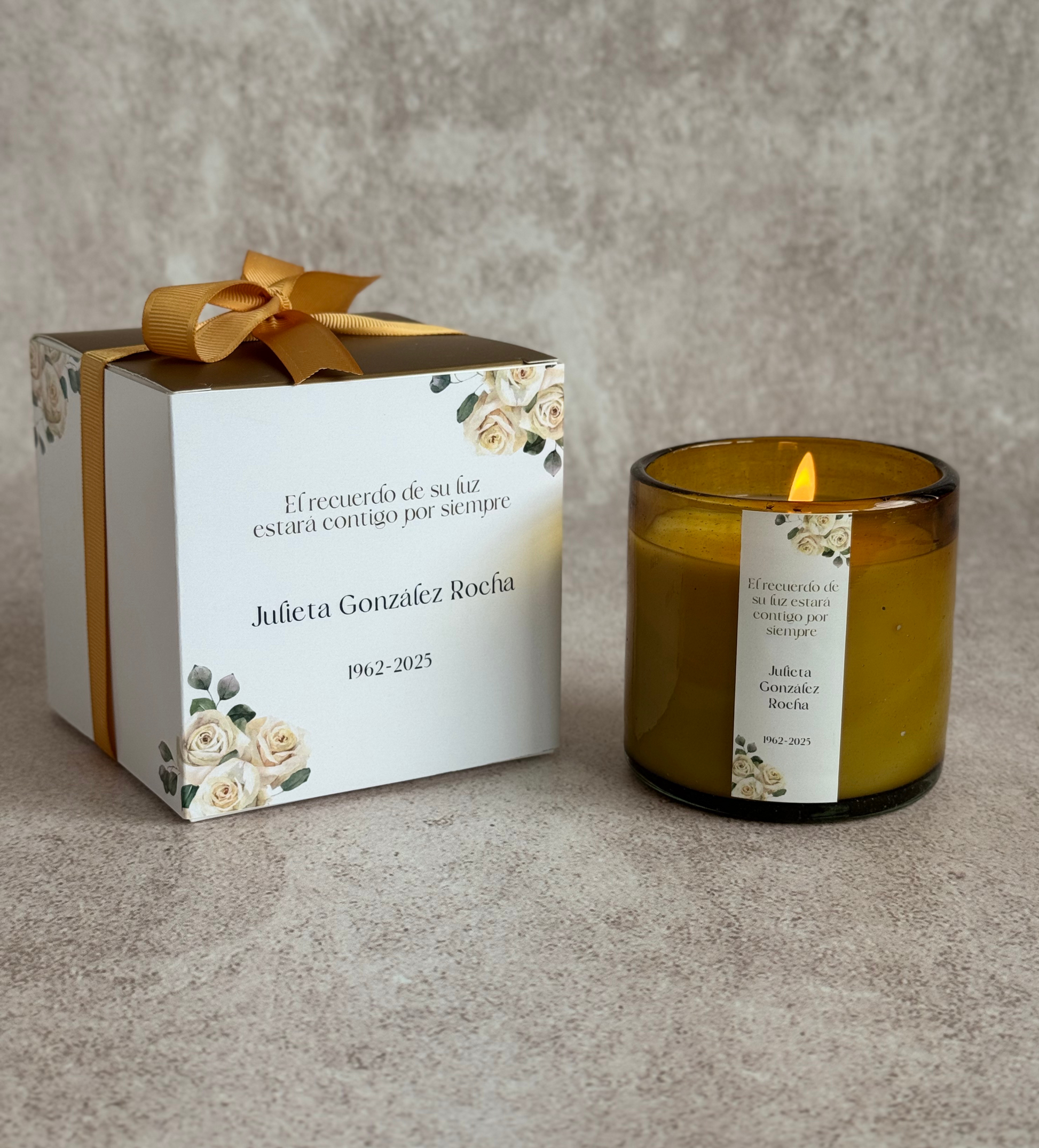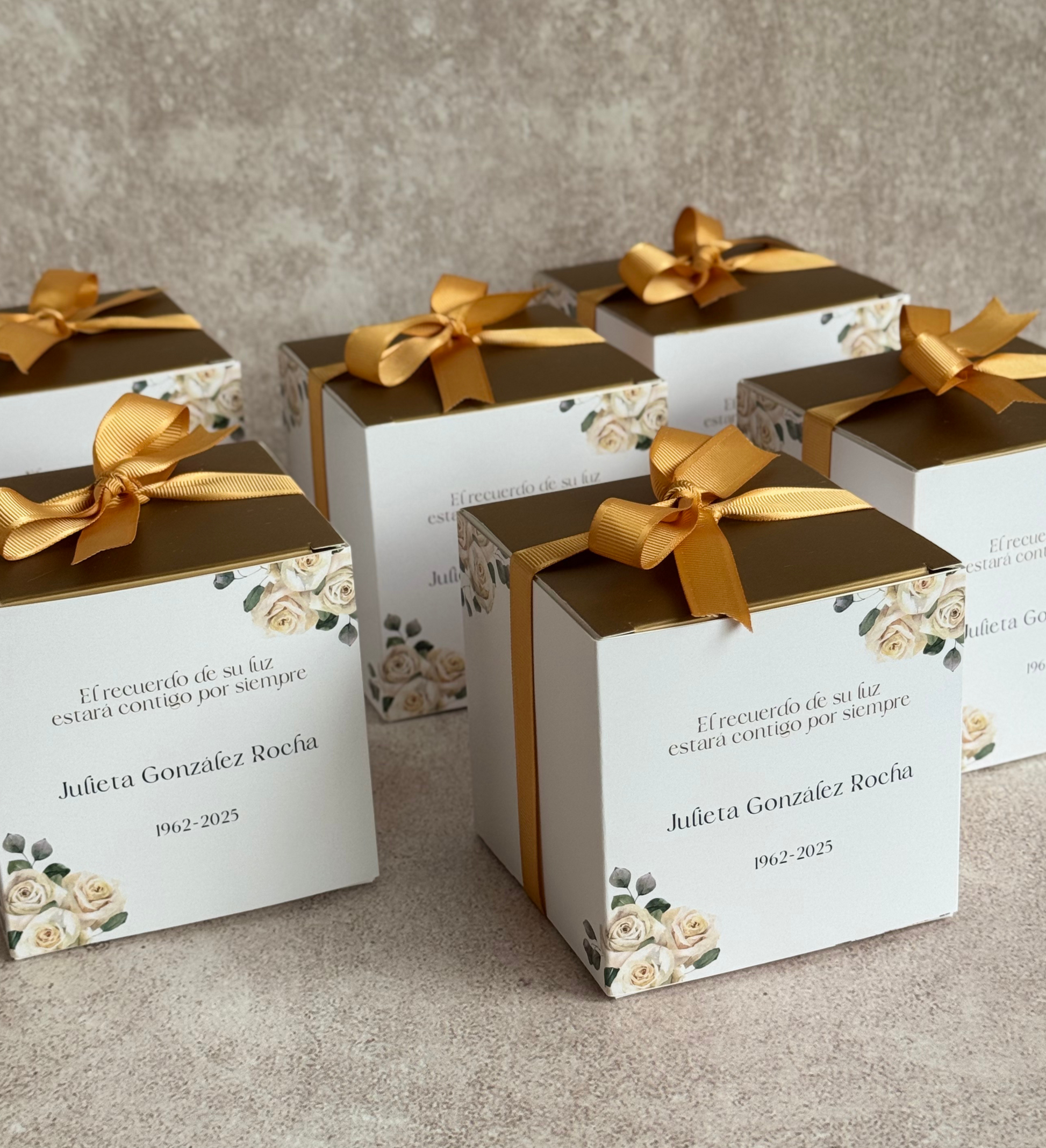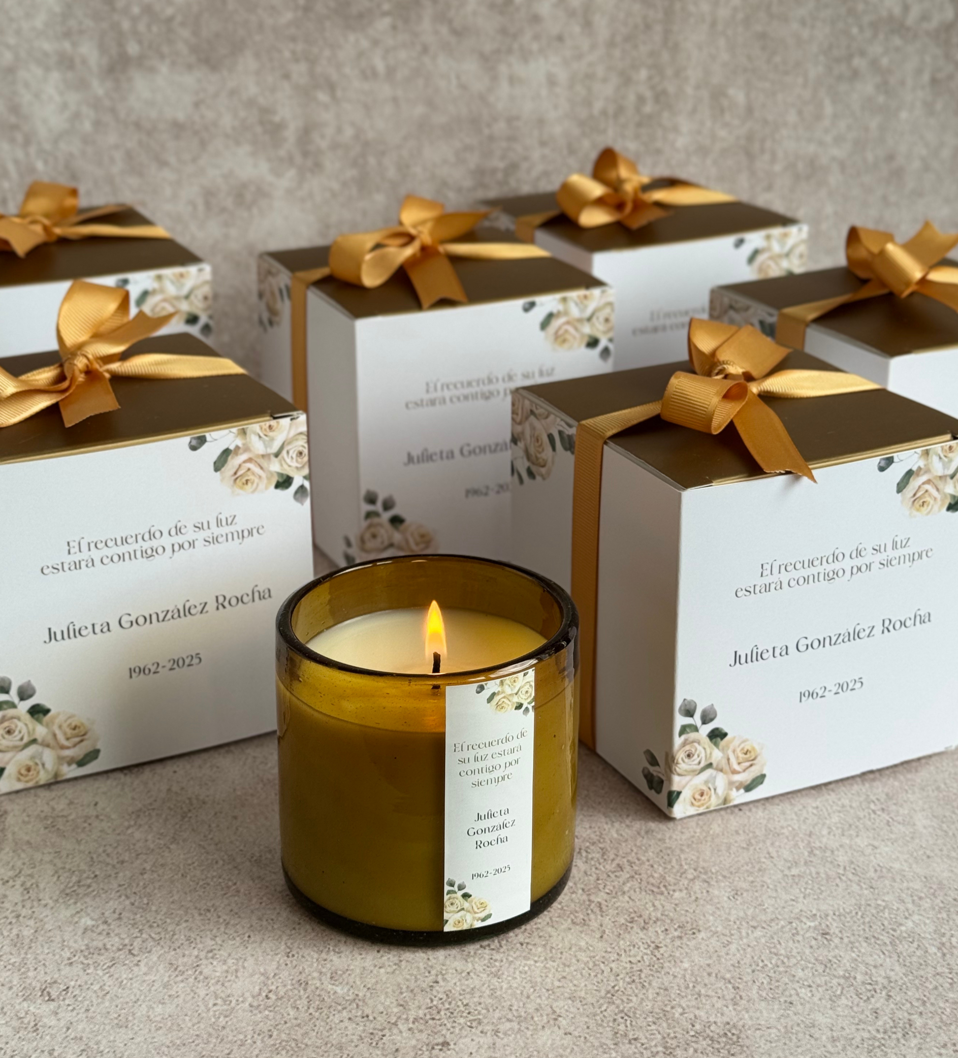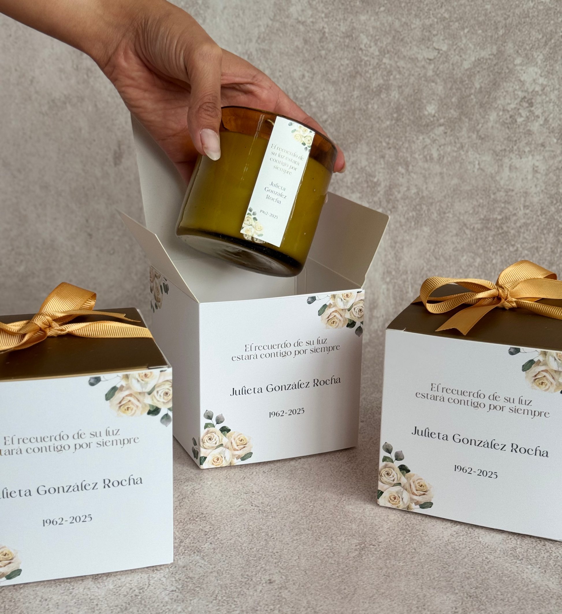 -Vela con aroma, diseño de empaque (caja 10x10x10cm) personalizado, etiqueta en vela y listón.