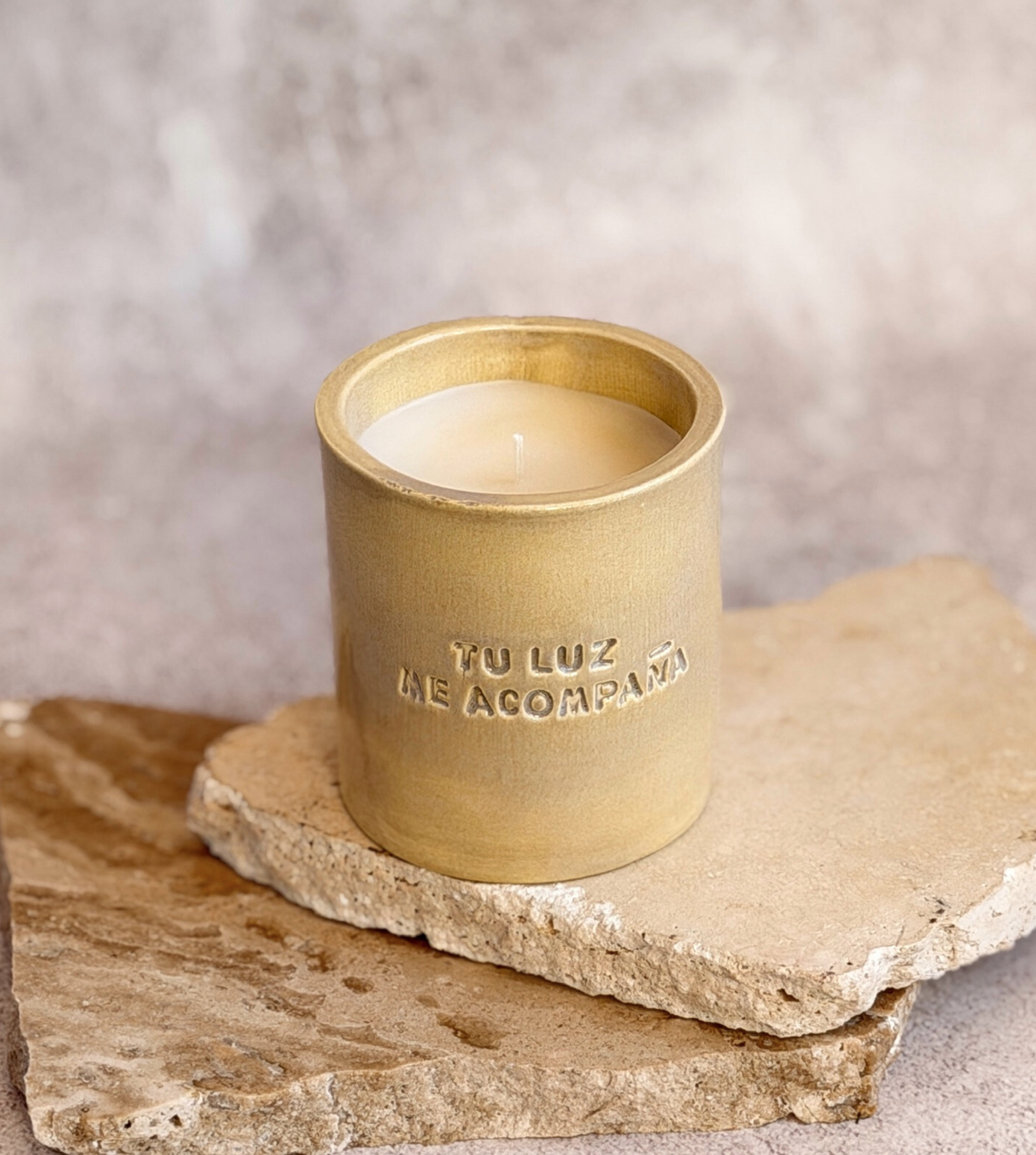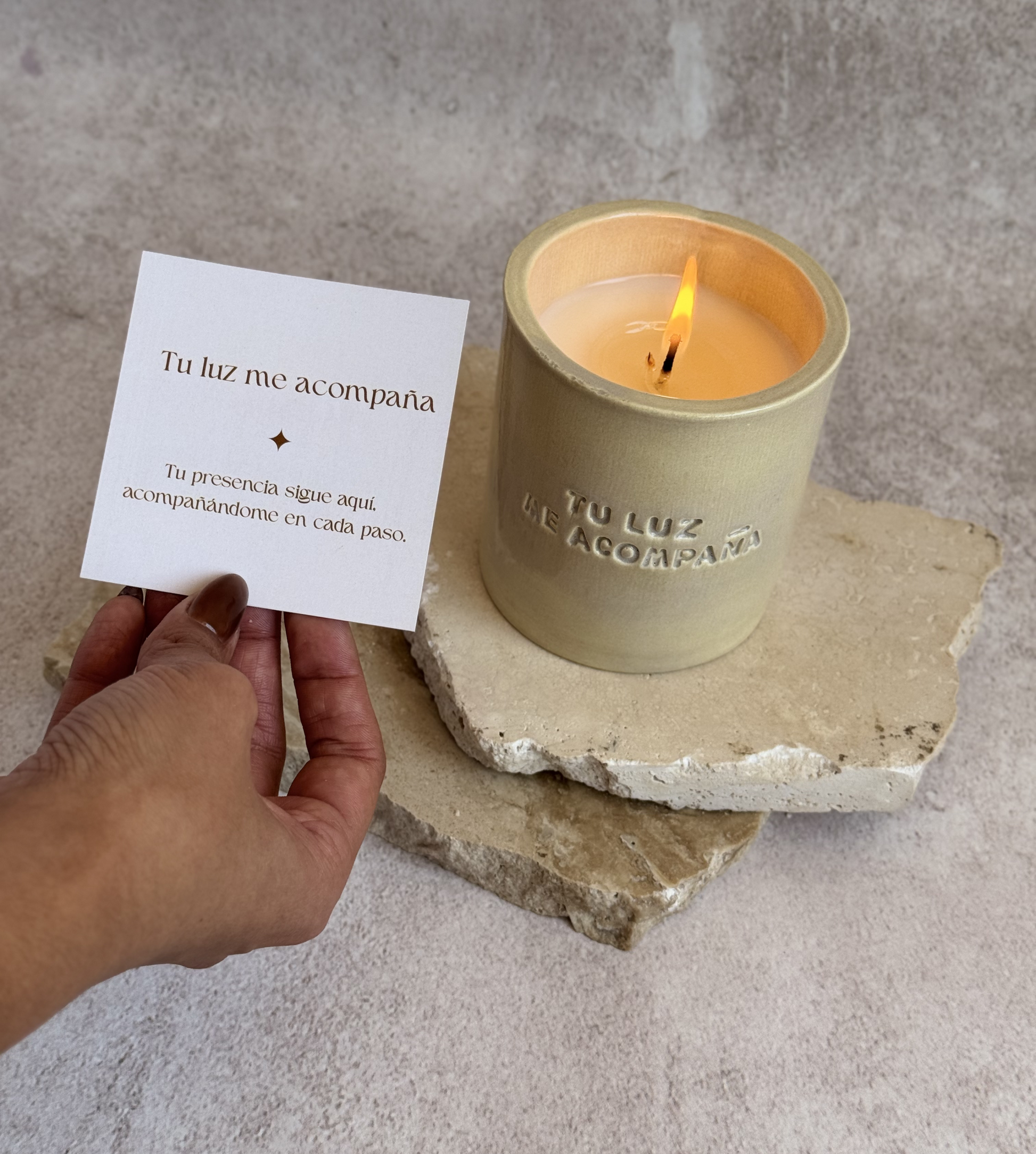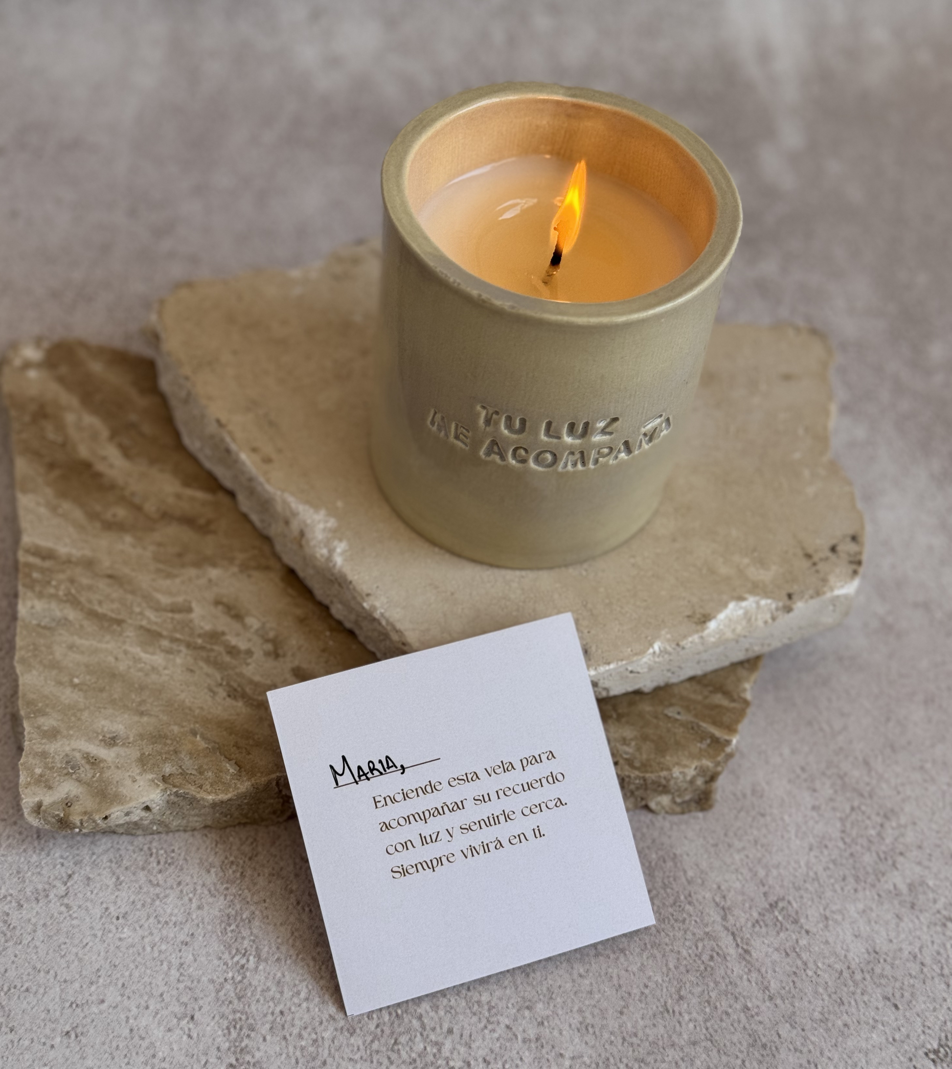 Tu luz me acompaña es una vela creada para acompañar momentos de recuerdo, duelo y amor eterno.