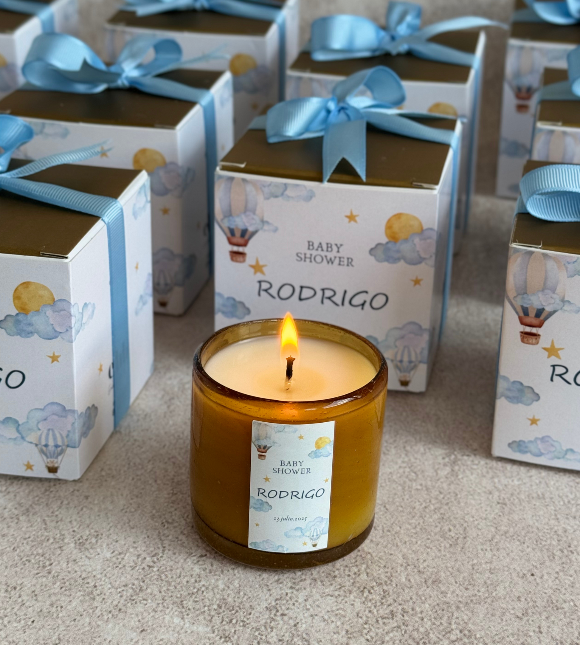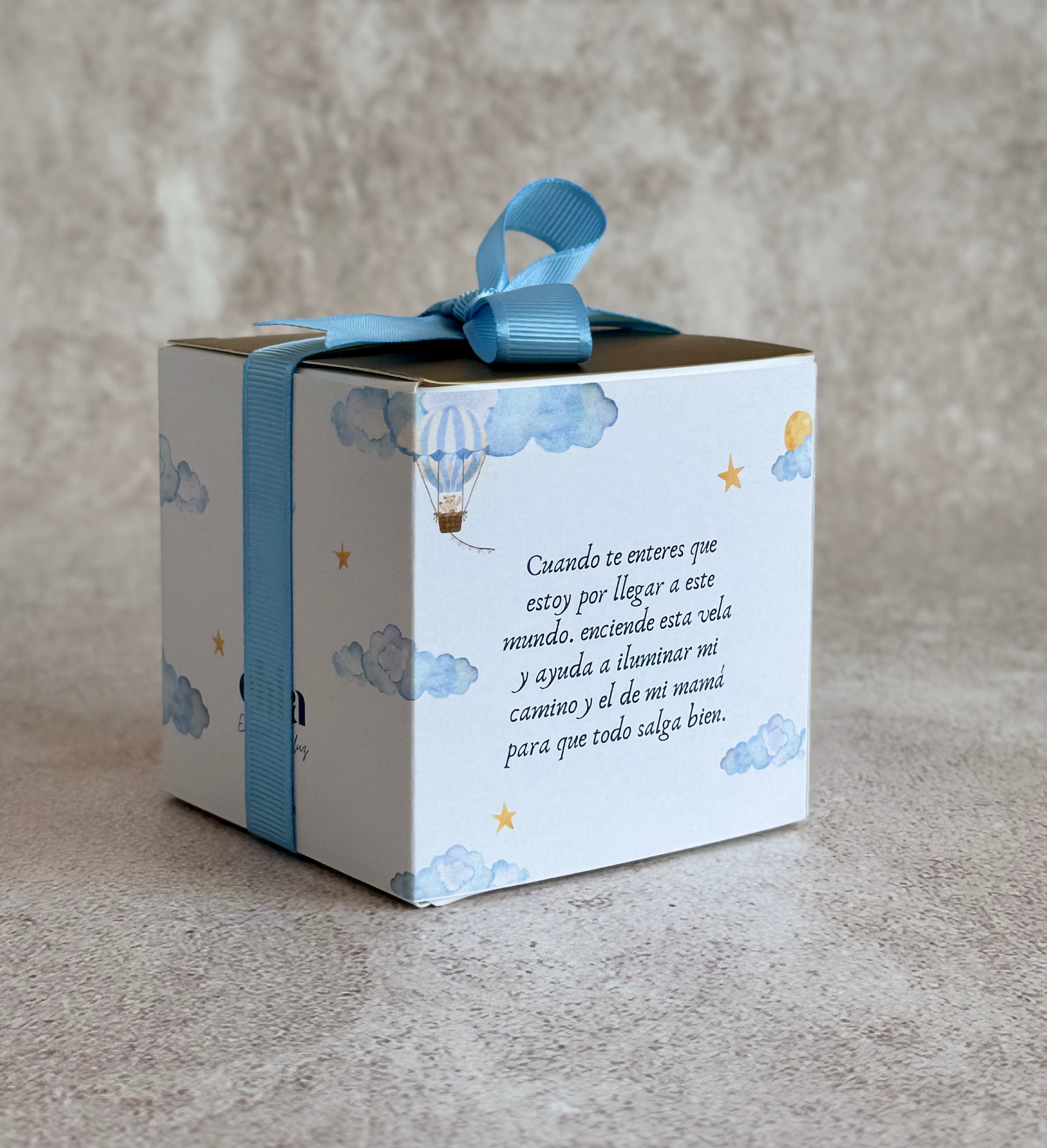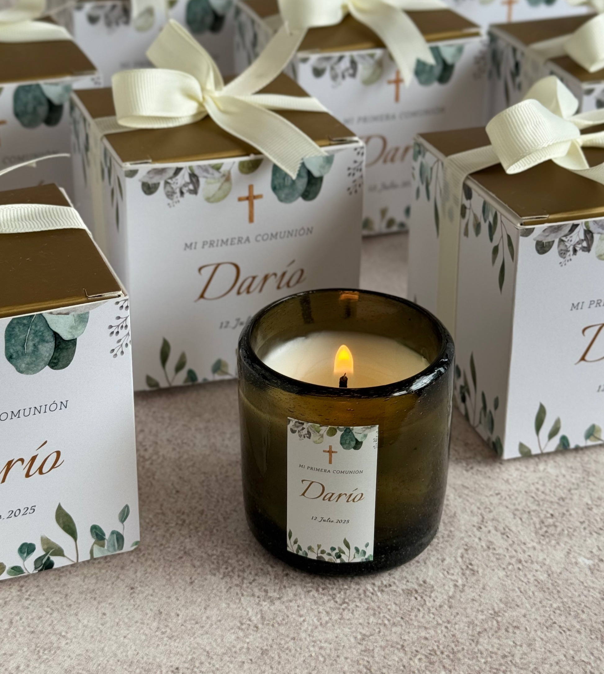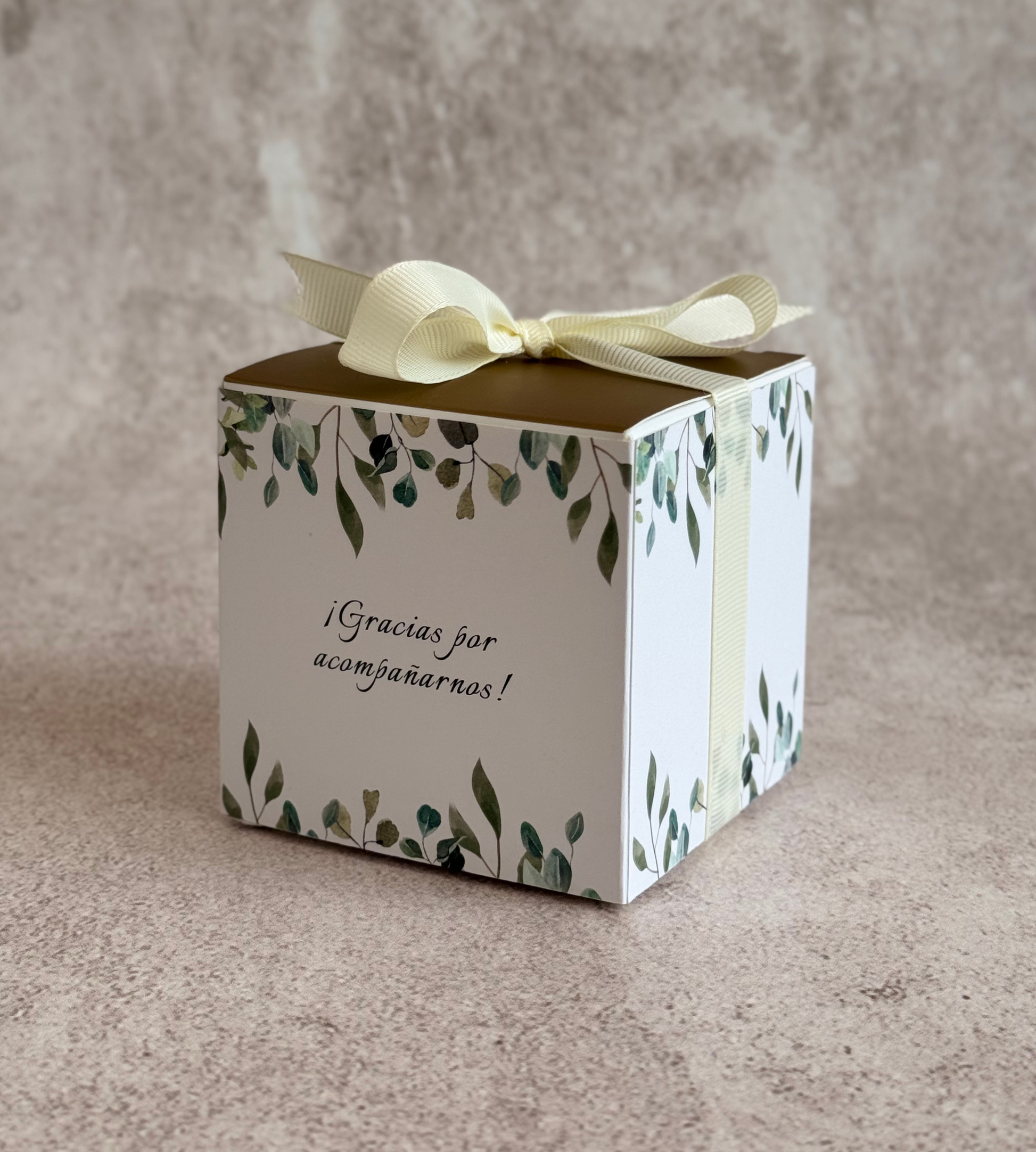 -Vela con aroma, diseño de empaque personalizado (caja 8x8x8cm), etiqueta en vela y listón.