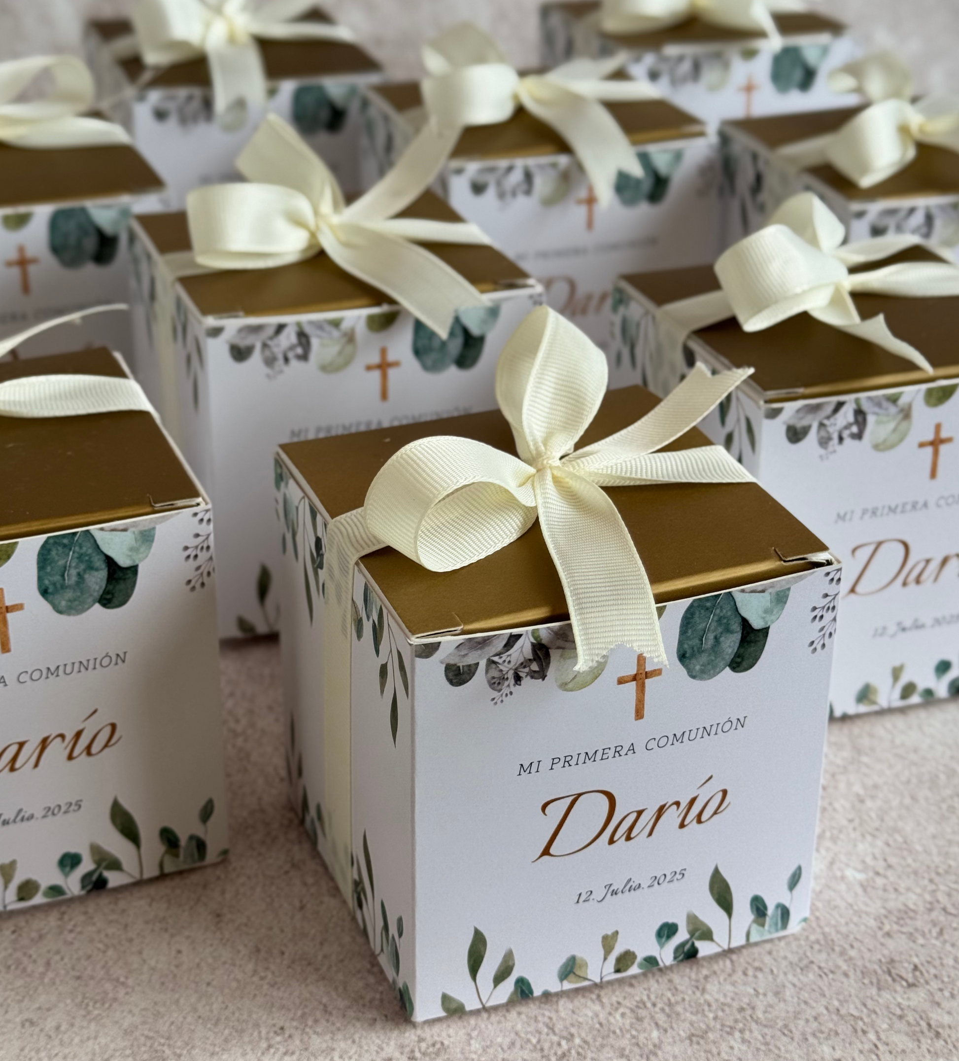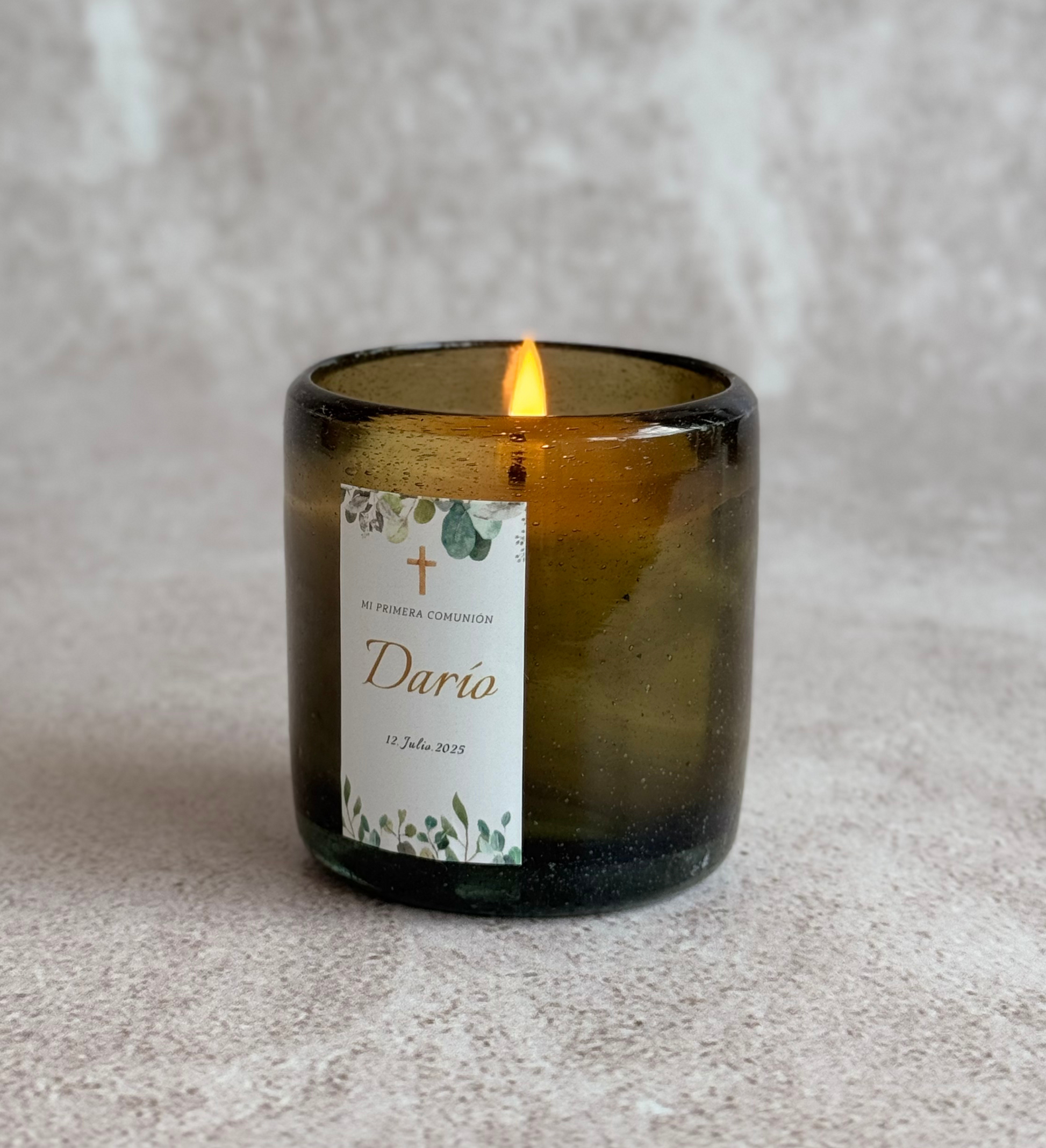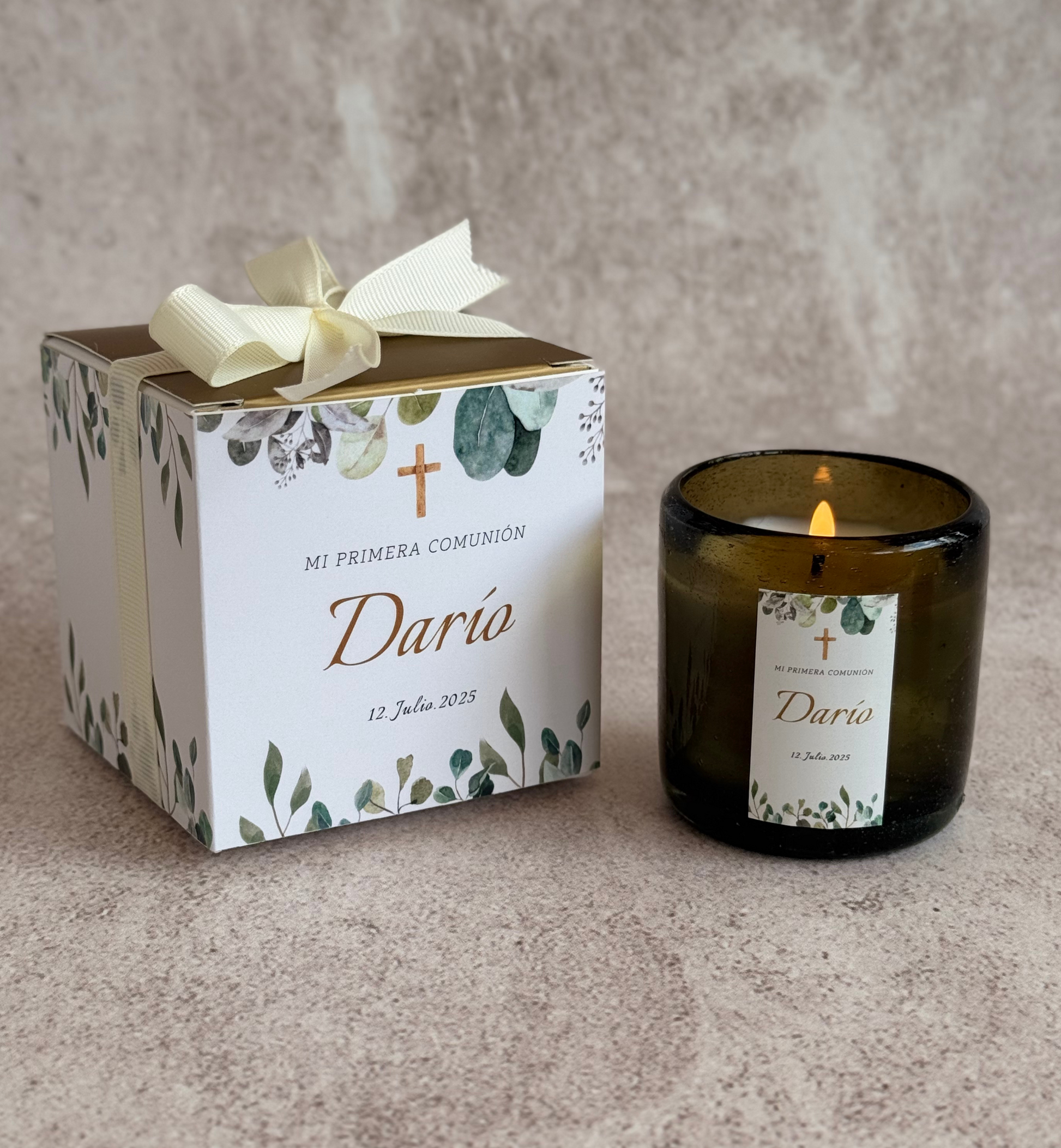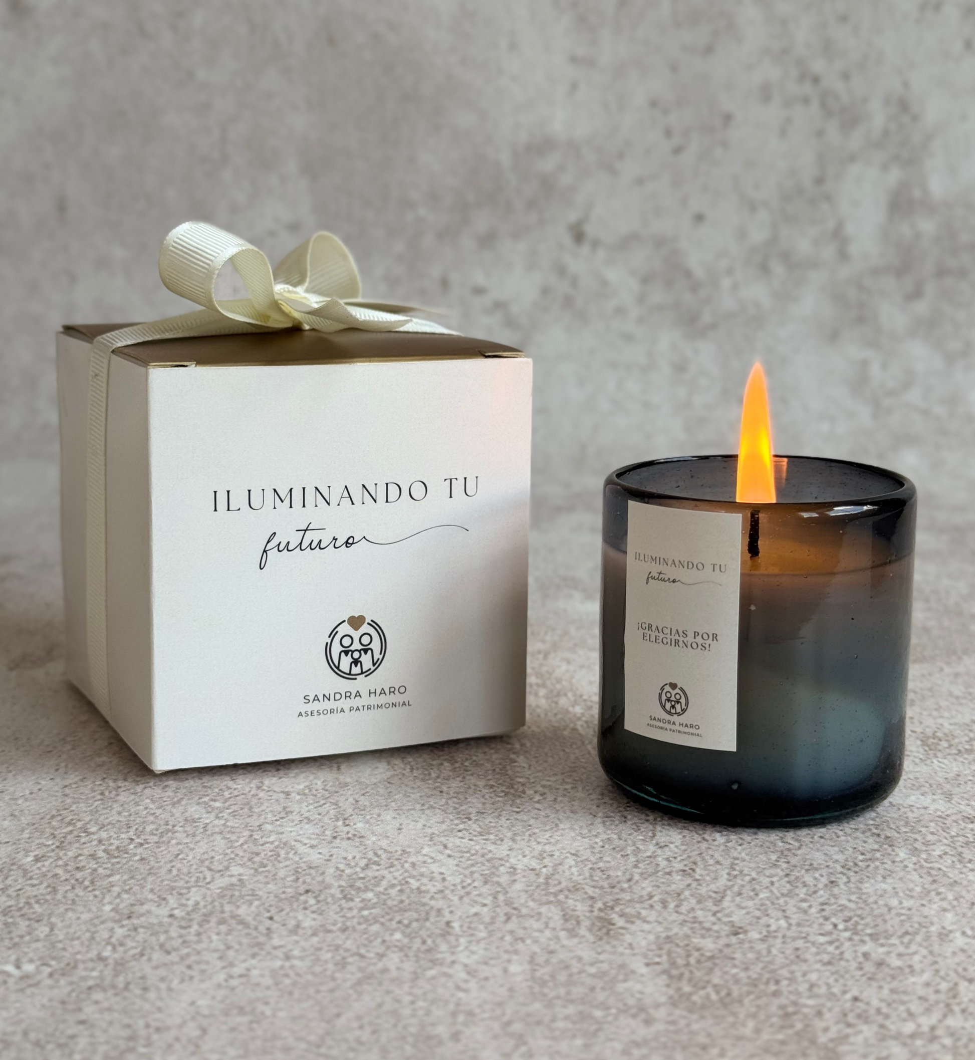 -Vela con aroma, diseño de empaque personalizado (caja 8x8x8cm), etiqueta en vela y listón.